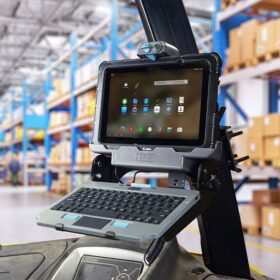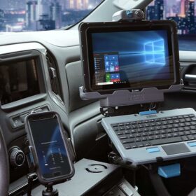 Stacje dokujące i uchwyty Gamber Johnson przeznaczone do wytrzymałych tabletów Zebra ET51/56 umożliwiają łatwe dokowanie i zwalnianie jedną ręką.